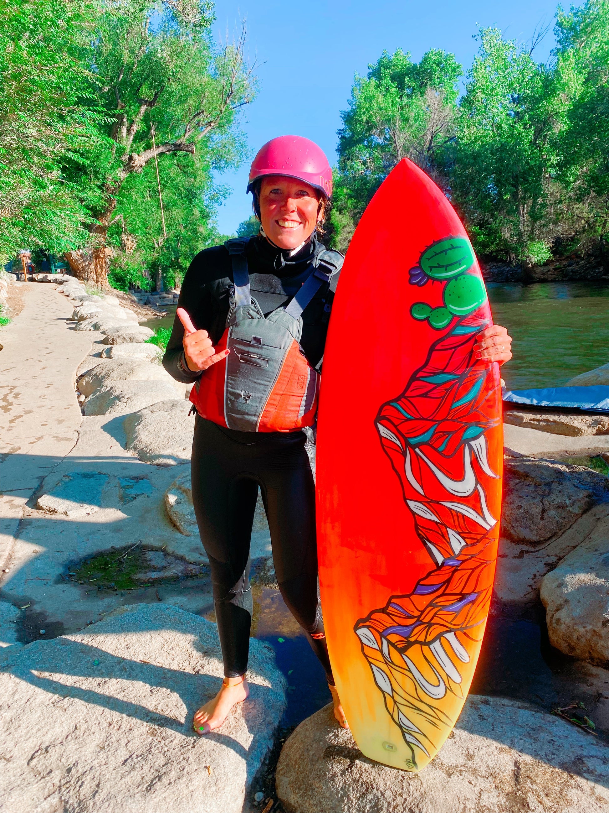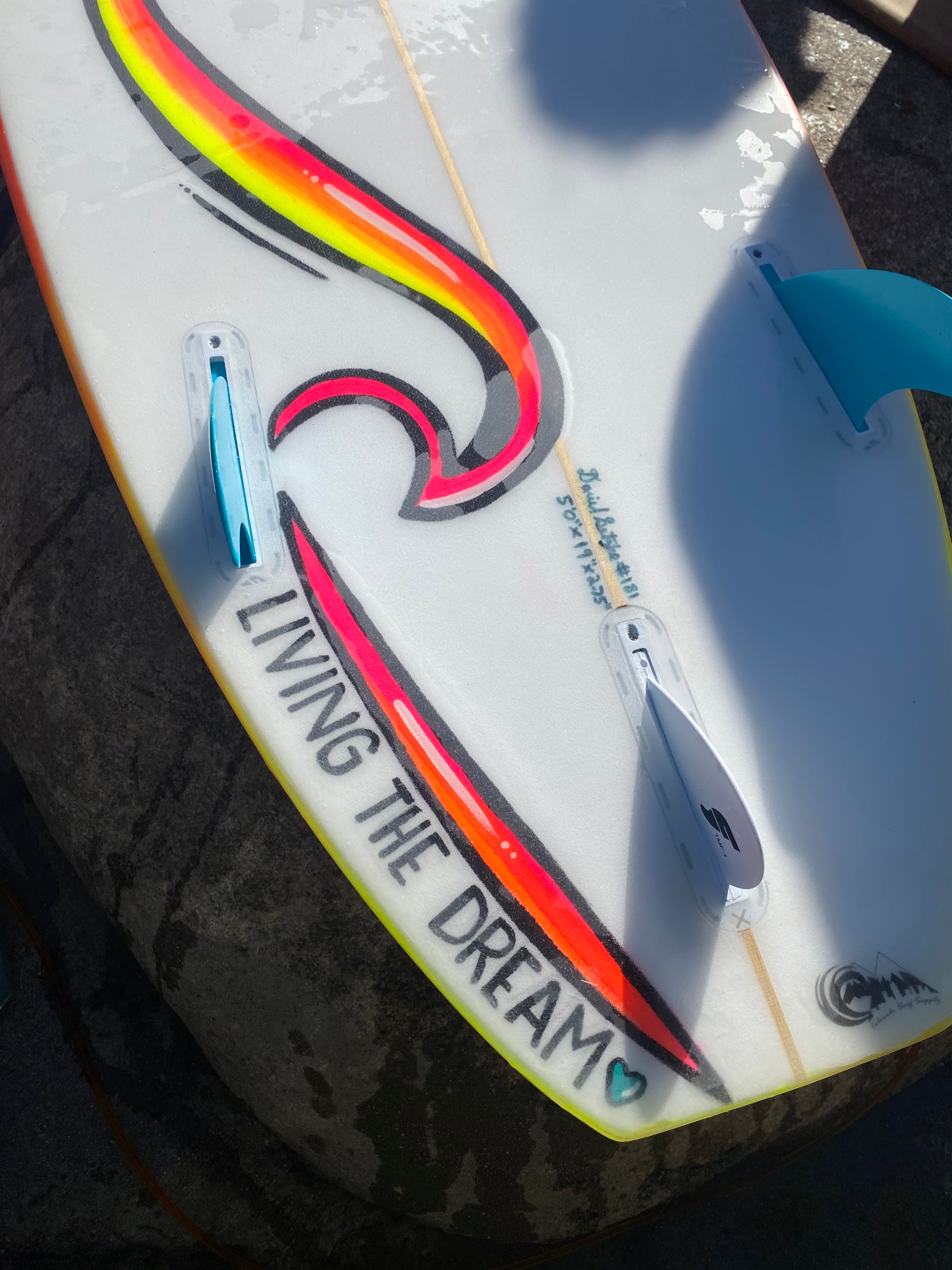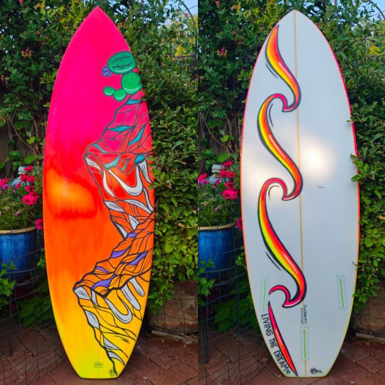 5' board hand painted directly on the foam and then glassed. Custom shaped board by Colorado Surf Supply and painted by Jess Oatman.